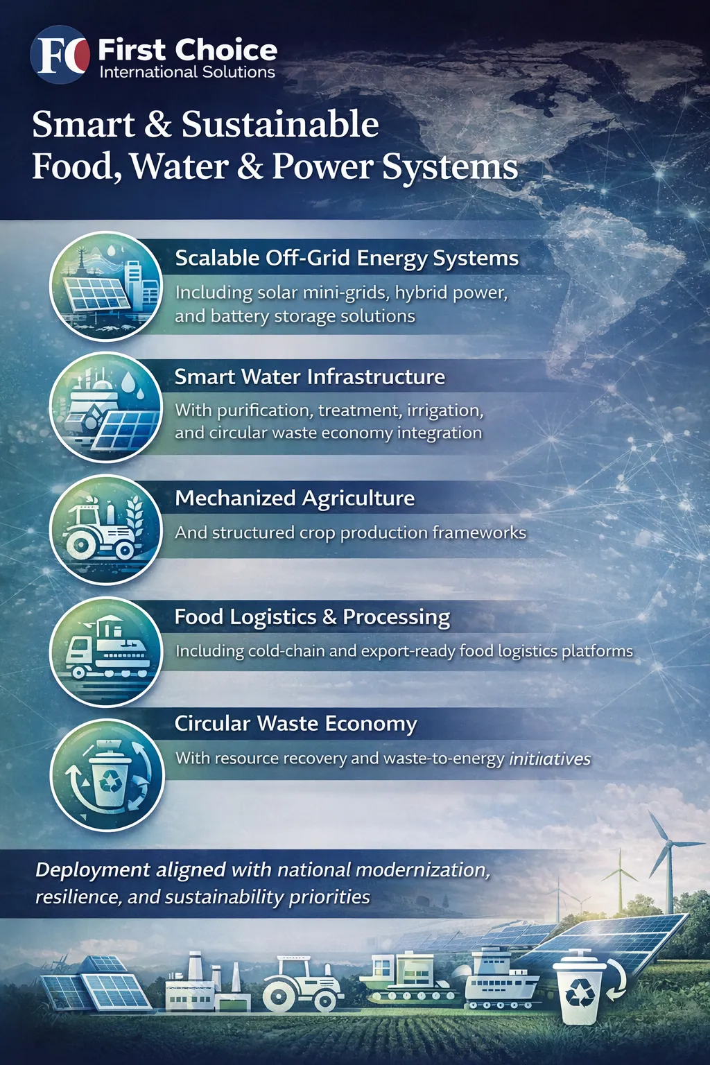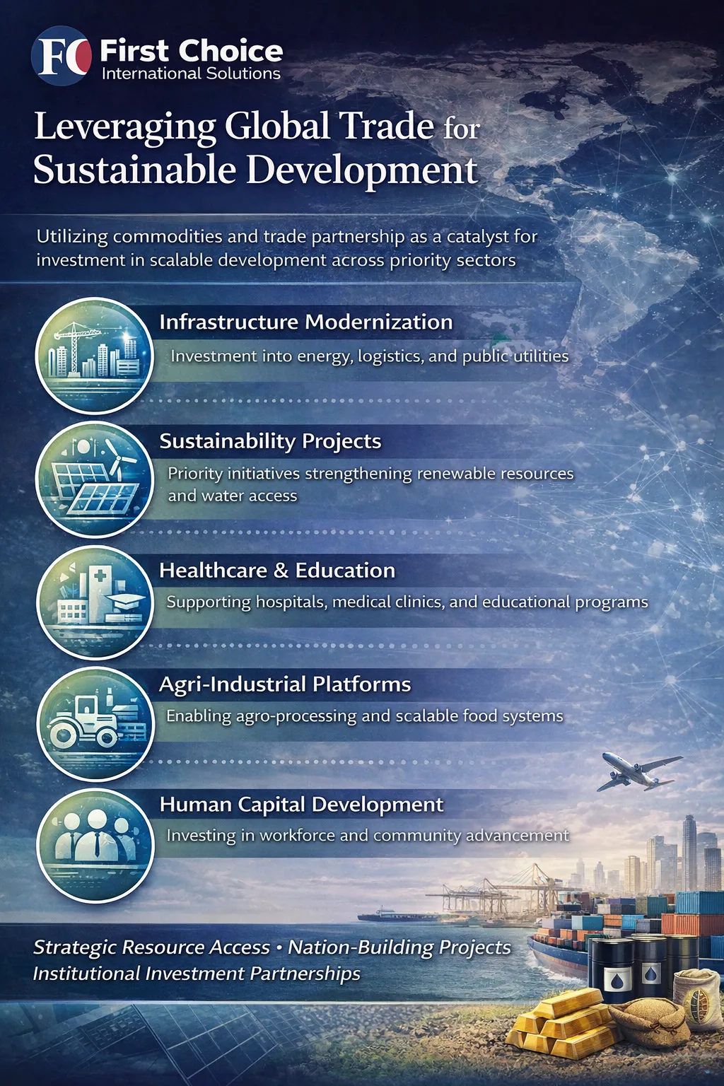 First Choice International Solutions Holdings Company, LLC (FCIS Holdings) facilitates structured access to sustainable infrastructure solutions and sovereign-aligned commodity sectors operating within formal public mandates.